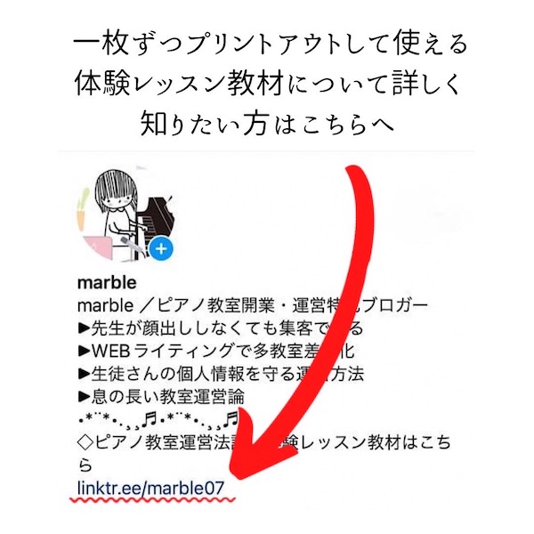 インスタはリンクが貼ってもハイバーリンク(外部サイトに飛ぶ)ということができませんが、ピアノの教室名とurlは文字列だけで載せておきましょう。