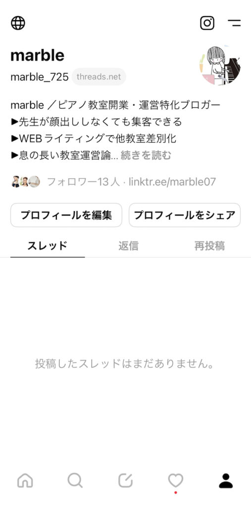 ちなみに私のThreads。リリースされてすぐ入れました。もうすでにお使いの先生がけっこういますよ!このアカウントは教室アカウントではないので運用方法を考え中につき投稿はまだありません笑